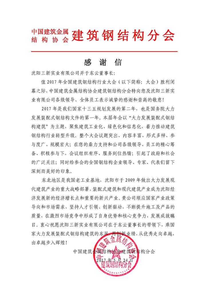 2017年全國建筑鋼結構行業大會勝利閉幕了,這是一個圓滿的大會和勝利的大會。作為承辦方,三新集團從會議的籌備到大會的服務全過程交出了完美的答卷,這是三新集團綜合實力的一次集中展現。中國建筑金屬結構協會建筑鋼結構分會特向于東云董事長致信表示感謝。這是協會及各界同仁對三新的認可,也說明各界對三新集團的了解和友誼不斷加深,預示著各方今后在鋼結構建筑領域的合作更加密切和廣泛,共同助推鋼結構行業轉型升級。