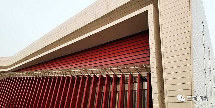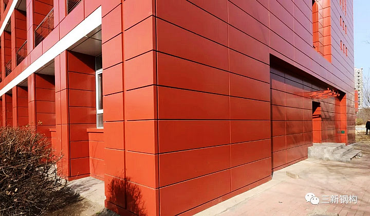 2、項目采用開放式金屬幕墻系統,凹槽、洞口、窗口、弧形造型、傾斜面折線、波紋造型的方案設計,金屬板采用磚紅色金屬板,生產后直接發運至現場安裝,金屬板顏色種類豐富且減少噴涂過程,縮短生產工期;