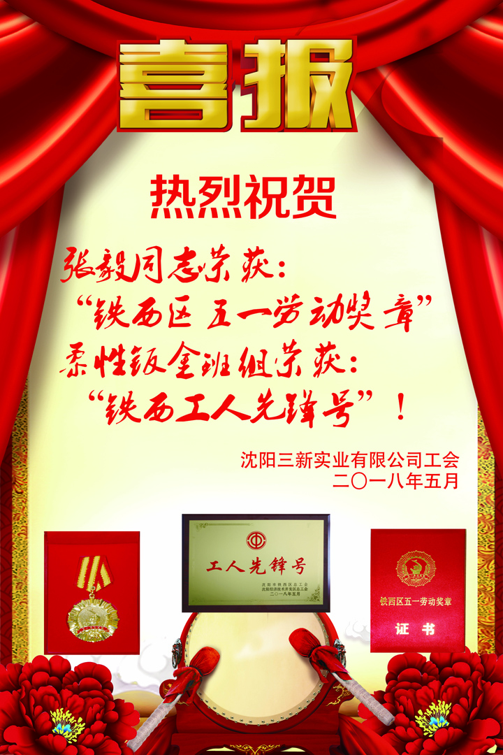 沈陽三新實業有限公司榮獲“鐵西五一勞動獎狀”,張毅同志榮獲“鐵西區五一勞動獎章”,柔性鈑金班組于永欣等9名同志榮獲“鐵西工人先鋒號”!