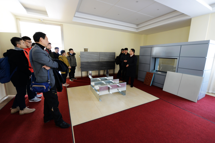 在揭牌儀式前,洪長禧總經理及公司領導首先陪同客人參觀了公司生產基地及產品展廳,師生們對我公司先進的裝備及產品贊不絕口,尤其是裝配式建筑展品給師生們留下深刻的印象。