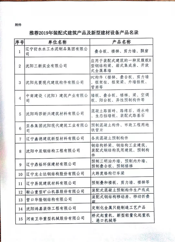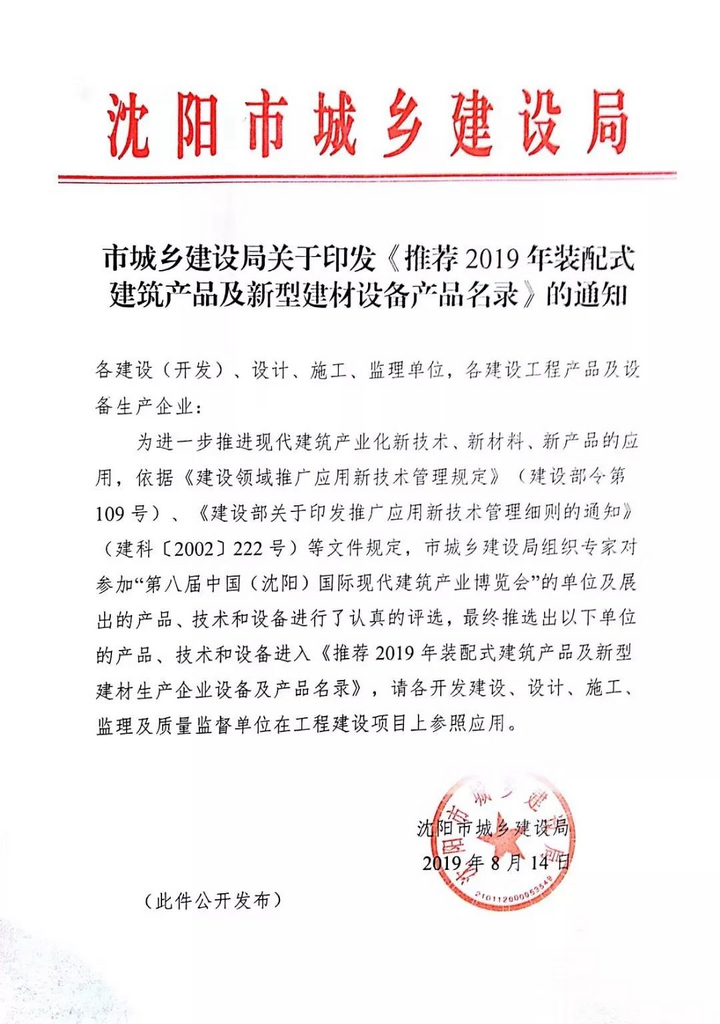 2019年8月14日,沈陽市城鄉建設局發布《推薦2019年裝配式建筑產品及新型建材設備產品名錄》,我公司雙腹扳H型鋼結構梁、箱式集成房、開放式金屬幕墻等產品成功入選。