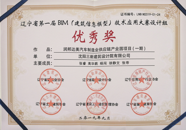 2019年10月18日,“遼寧省第一屆BIM(建筑信息模型)技術應用大賽”召開了頒獎大會,頒發獎牌及榮譽證書。我公司由張睿、高華鵬、楊闖、徐敬文、張帝組成的BIM團隊提交的參賽項目《潤邦達美汽車制造業供應鏈產業園項目(一期)》斬獲遼大賽優秀獎。