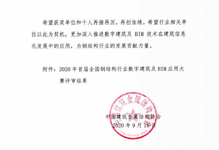 由中國(guó)建筑金屬結(jié)構(gòu)協(xié)會(huì)主辦的《2020年首屆全國(guó)鋼結(jié)構(gòu)行業(yè)數(shù)字建筑及BIM應(yīng)用大賽》評(píng)審結(jié)果于2020年9月15日揭曉。我公司由張睿、高華鵬、楊闖、徐敬文、張帝組成的BIM團(tuán)隊(duì)提交的參賽項(xiàng)目《潤(rùn)邦達(dá)美汽車制造業(yè)供應(yīng)鏈產(chǎn)業(yè)園項(xiàng)目(一期)》斬獲大賽優(yōu)秀獎(jiǎng)。