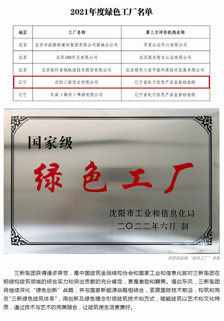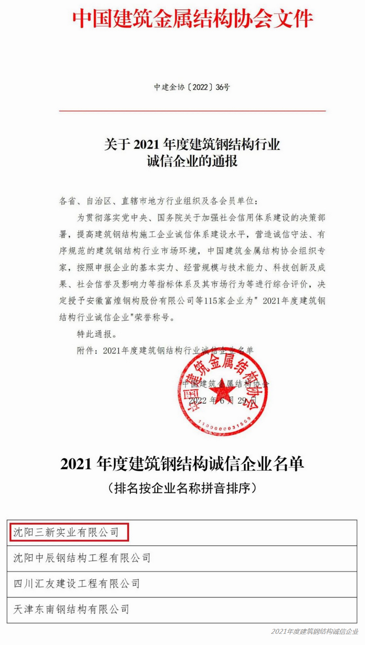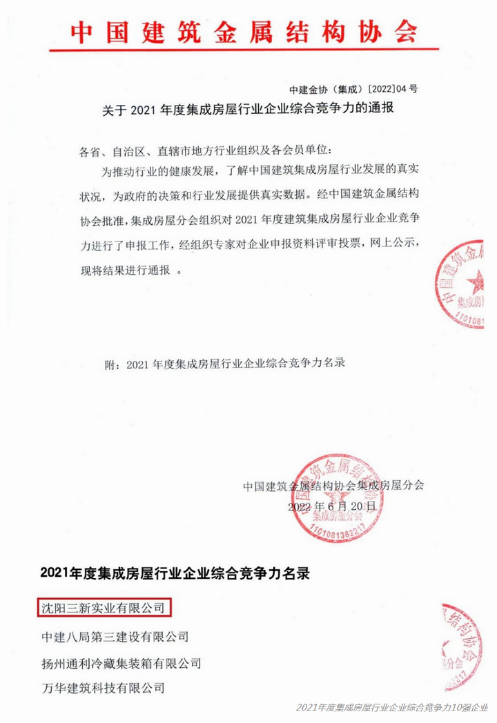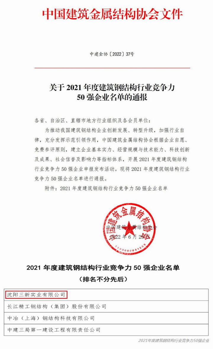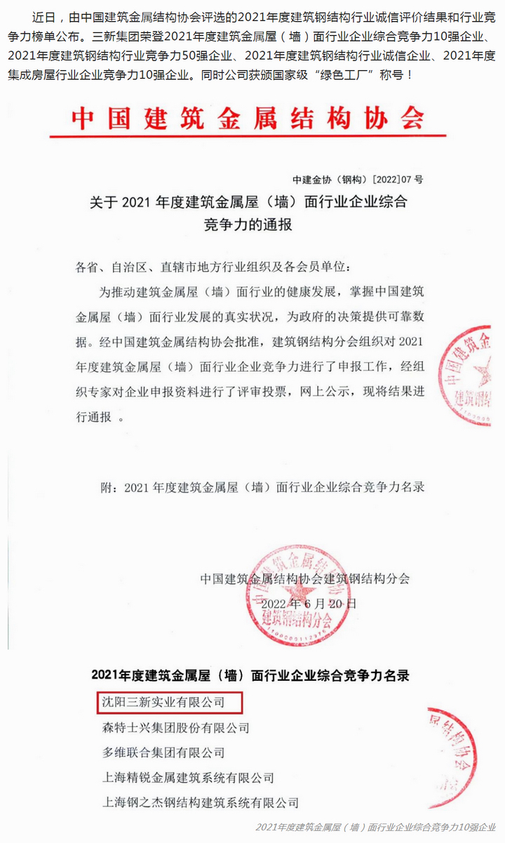 熱烈祝賀三新集團(tuán)榮獲“2021年度建筑金屬屋(墻)面行業(yè)企業(yè)綜合競爭力10強企業(yè)”等多項殊榮!