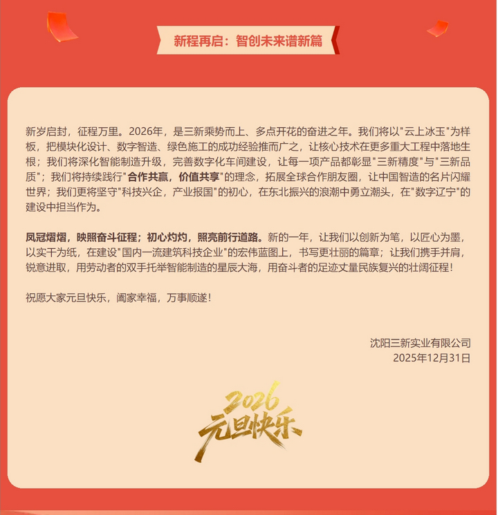 鳳冠彰碩果 新質(zhì)啟華章——沈陽三新實(shí)業(yè)2026年元旦獻(xiàn)詞